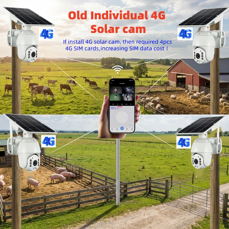 Traditionally, an “Old Solution” for a farm without internet required four individual 4G cameras. Each camera acted as a standalone cellular device, requiring its own SIM card and a separate data subscription.