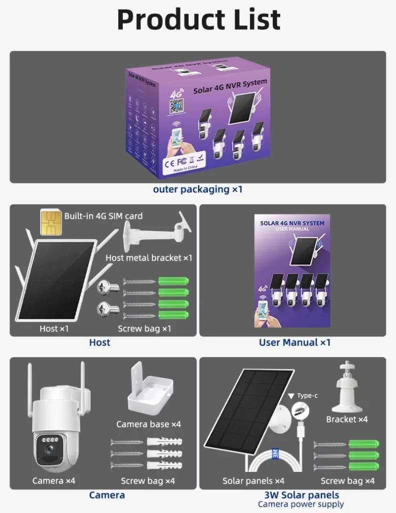 ◐ Solar 4G 4CH Wireless NVR*1+ Solar Wireless IPCAM*4pcs
